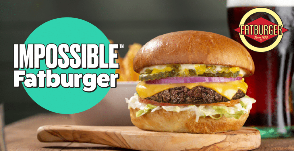 We’re excited to introduce the Impossible Fatburger. This incredible made-from-plants burger patty looks and tastes like beef! Our new Impossible Fatburger starts with a juicy, tasty Impossible burger patty, topped with cheese, red onion, pickles, relish, mustard and mayonnaise. Served on a toasted Brioche bun with crisp lettuce and ripe tomato.